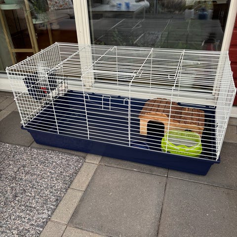 Smådjurshage bur med gallerlock i blått och vitt. Bur med plastbotten och metallgallerlock som ger god ventilation. Passar mindre smådjur som till exempel gnagare eller kaniner av mindre storlek. Inredning som ramp och hylla ingår enligt bild. Lämplig för inomhusbruk. Rengörs noggrant innan försäljning