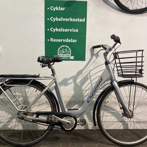 Skeppshult Soft stadscykel med 28" hjul. Cykeln har lågt insteg, grå ram och upprätt körställning. Utrustad med navväxlar med vridreglage, kedjeskydd, skärmar, stöd, pakethållare bak och framkorg i metall. Passar för vardagscykling i stadsmiljö och kortare pendlingsturer.