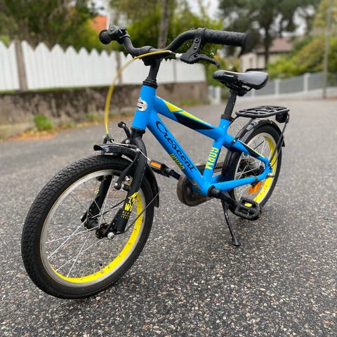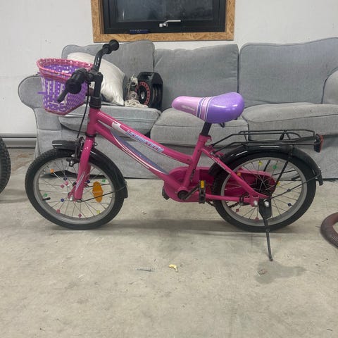 Fint skick, några mindre förgavskav i korgen. Barncykel med 16" hjul i rosa färg. Utrustad med framkorg och sadel anpassad för barn. Passar för barn som behöver en cykel i storlek 16" för vardagscykling och lek.