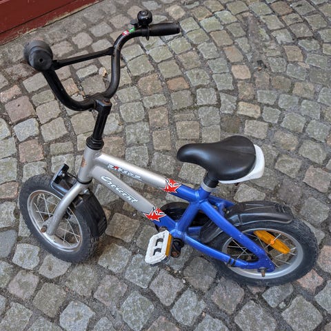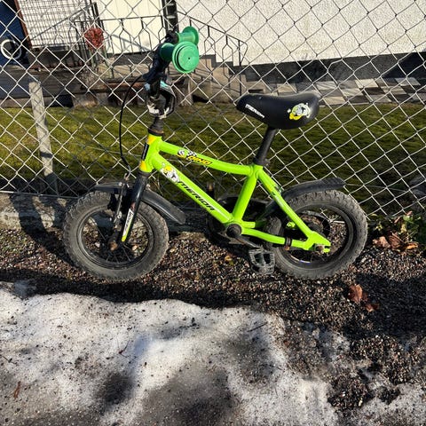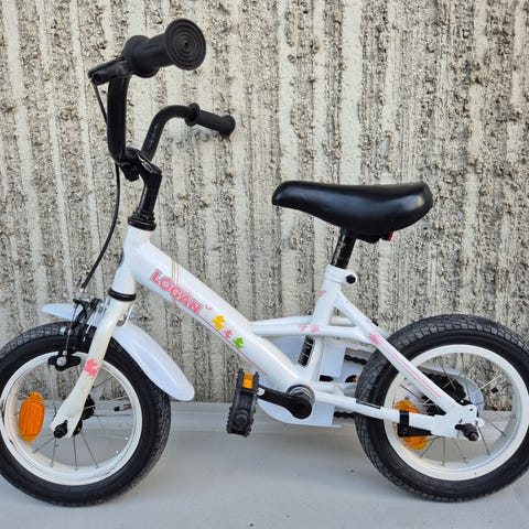 Barncykel med 12" hjul i röd och vit färg. Utrustad med frammonterad korg, kedjeskydd och sadel med blommönster. Passar mindre barn som ska lära sig cykla eller använda cykel på gård och cykelvägar.