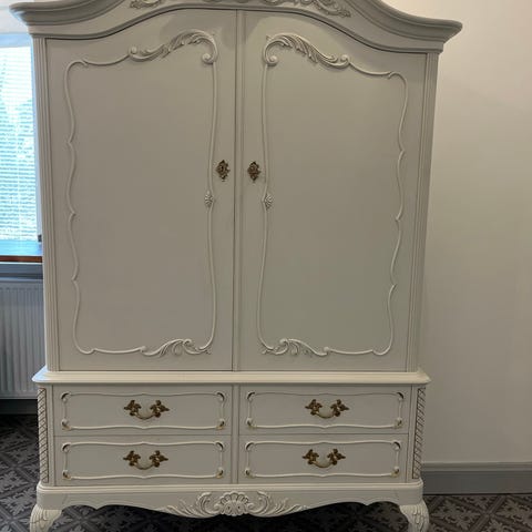 Ett vackert skåp med hyllplan och lådor. Skåpet är stabilt och gediget. Nyckel medföljer.