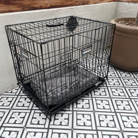 En liten hundbur (50x35x35). Sammanfällbar konstruktion som sparar plats vid förvaring. Nätpaneler på sidorna för god luftcirkulation.