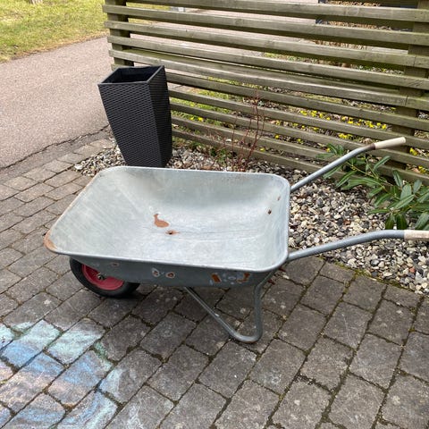 Skottkärra och metallkärl trädgård