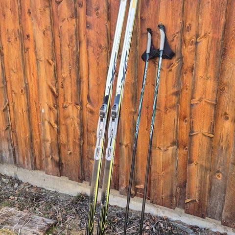 Kit med skidor och stavar samt pjäxor strl 43. Använda ett tillfälle.