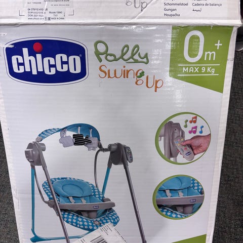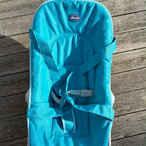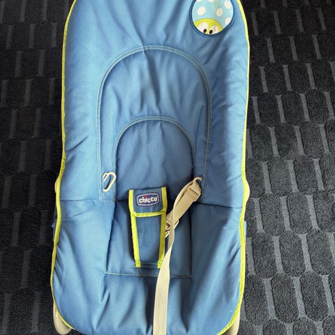 Chicco babysitter i grått tyg med vadderad sits och säkerhetssele. Ställning i metall/plast med båge ovanför sitsen där leksak kan hängas. Anpassad för spädbarn och småbarn som viloplats eller för lugn aktivitet. Tyget ser ut att vara mjukt och ombonat för barnet. Lämplig att använda inomhus på plant underlag.
