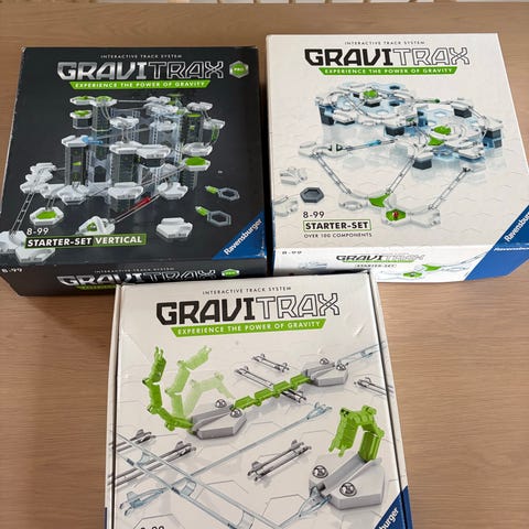 Gravitrax Starter Set kulbana byggsystem för barn. Setet innehåller olika byggdelar i plast och metall, bland annat basplattor, spår, pelare, start- och målmoduler samt kulor i flera färger. Systemet är avsett för att konstruera egna banor där kulorna rullar genom olika nivåer och hinder. Passar för barn från 8 år och uppåt enligt förpackningen och kan användas både fristående och tillsammans med andra Gravitrax-delar i samma serie.