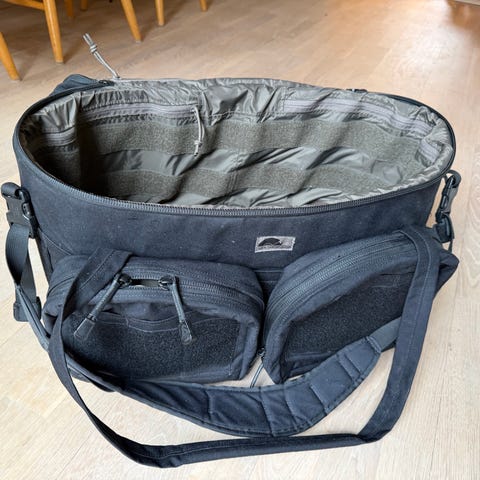 Väskan har flera sidofack och ett isolerat toppfack. Två stora genomskinliga beteslådor ingår.