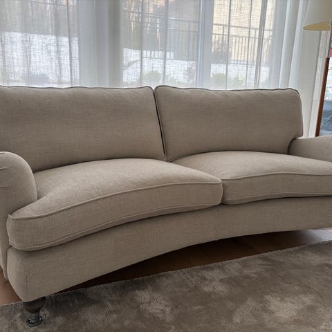 Tidlös och ytterst välgjord soffa i Howardstil från Bröderna Anderssons. Klädd i ett mycket vackert rött tyg (svårt att återge i bild).
