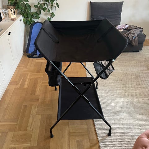 Jollyroom skötbord i grå färg. Skötbordet har en skötyta med säkerhetsbälte och upphöjda kanter runtom. Under skötytan finns praktiska förvaringshyllor för blöjor, kläder och tillbehör. Stommen är i hopfällbar modell med kryssben i metall för stabilitet. Passar för blöjbyten och omvårdnad av spädbarn och småbarn i hemmet.