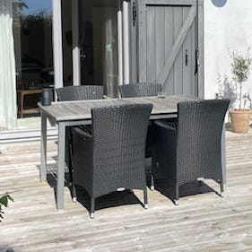 Matgrupp för utomhusbruk bestående av ett rektangulärt bord och stolar i kombination av trä och metall. Bordsskivan är uppbyggd av trälameller med mörk metallram och ben. Stolarna har trädetaljer i sits och rygg samt metallstativ. Stolsdynor i neutral, ljusgrå färg ingår. Passar som utemöbler på altan, balkong eller uteplats för måltider och samvaro.