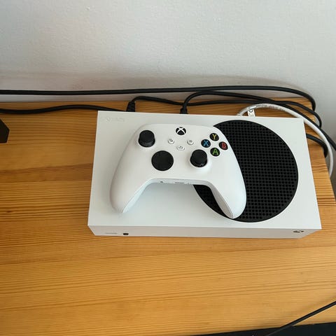 Microsoft Xbox Series S spelkonsol i vit färg. Konsolen är en digital modell i Xbox Series-familjen och används för spel, streaming och andra underhållningsappar. På bilden syns en vit trådlös handkontroll som hör till konsolen. Passar för anslutning till TV eller skärm via HDMI och stödjer moderna spel och tjänster inom Xbox-ekosystemet.