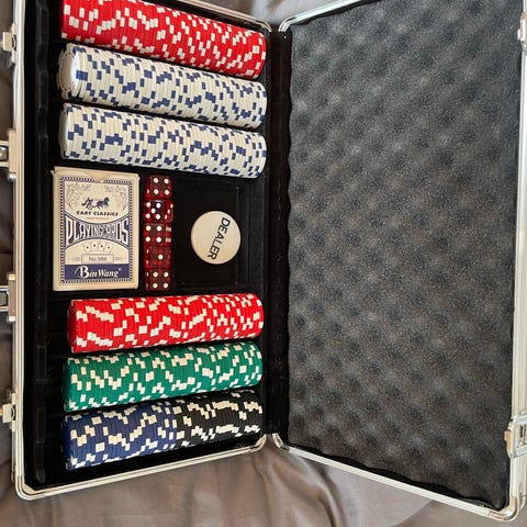 Multipokerset med 500 st pokerbrickor. Setet innehåller marker i flera färger, spelkort och dealerknapp. Avsett för pokerspel i hemmet eller liknande miljöer.