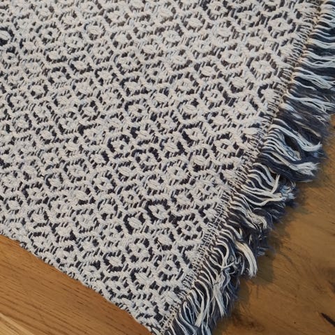 Säljer en otroligt vacker matta i kleinblått med vita fransar.