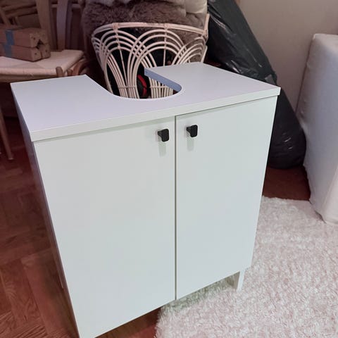 Vitt badrumsskåp från IKEA med 2 flyttbara hyllplan. Vit blank framsida/vita matta sidor.