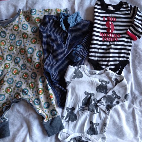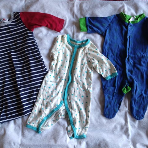Den randiga är i mjuk bomull och de andra med fötter är i en sval frotté. Säljer fler paket och kan skicka flera tillsammans.