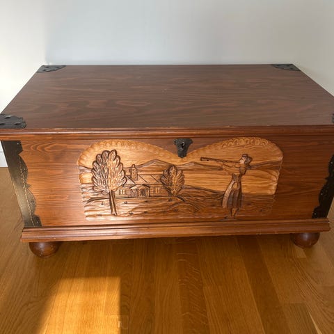 Vattenfläckar på toppen. Kan användas i befintligt skick eller restaureras. Handtag och hänglås finns