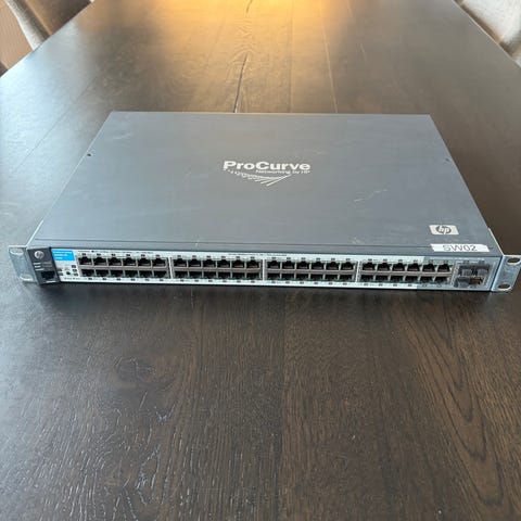 HP ProCurve nätverksswitch med 8 Ethernet-portar på fronten. Enheten är avsedd för trådbundna nätverk och kan användas för att koppla ihop flera datorer och nätverksenheter i hem- eller kontorsmiljö. Strömadapter medföljer enligt bild. Passar för utökning av befintligt nätverk eller som central kopplingspunkt i mindre nätverk.