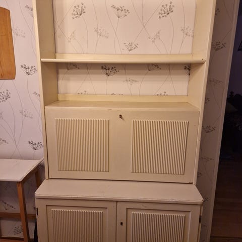 Bokhylla i ek. Grundmålad med vit snickerifärg.