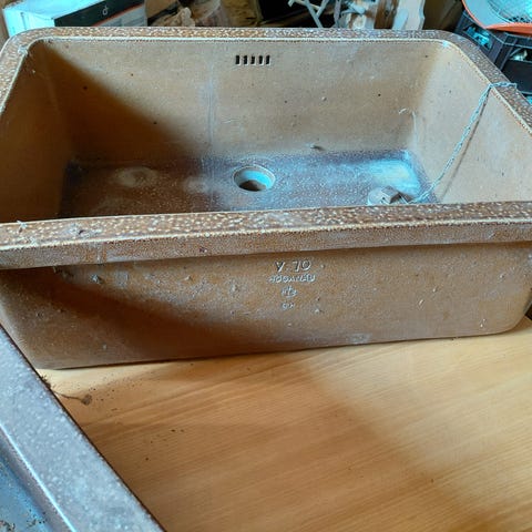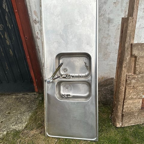 Diskbänk med dubbeldiskho i rostfritt stål. Utrustad med köksblandare och avloppsanslutningar enligt bilder. Passar för montering i kök eller grovkök där man önskar två separata hoar och lång arbetsyta runt om. Rostfritt material gör ytan lätt att rengöra och motståndskraftig mot fukt och smuts. Gammal men går verkligen att putsa upp och använda! Hämtas idag i Enskede.