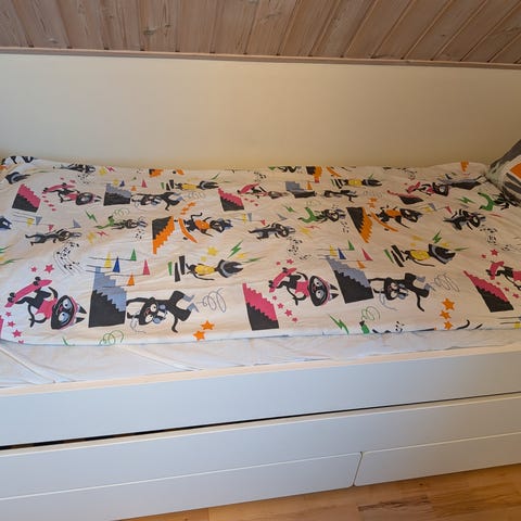 IKEA enkelsäng i vit färg med inbyggd förvaring i form av flera utdragslådor under sängen. Sängen är avsedd för ett barn eller en person och placeras mot vägg. Passar i barnrum eller mindre sovrum där extra förvaringsutrymme behövs under sängen.
