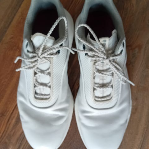 Cutter golfskor med spikes, storlek 40-41. Skorna är vita med svart innersida och har snörning framtill. Yttersulan har fasta spikes som går att byta för bra pålitligt grepp på golfbanan. Ovandelen är i syntetmaterial med textilpartier för ventilation. Insidan visar slitage och skador vid hälkanten på båda skorna.