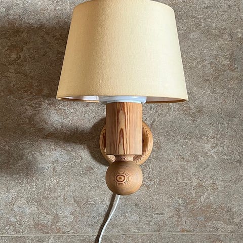 Ett par riktigt charmiga 70-tals retro vägglampor från Solbackens svarveri gjorda i furu vid namn 1461. De går ca 16 cm ut från väggen. Är lika snygga i sovrummet, vardagsrummet eller i stugan. De fungerar och är i fint begagnat skick. Dock har de olika stickkontakter och spår av färg på sladden. Se bilder för egen bedömning och hör av dig om du har frågor. Skickas utan glödlampor.