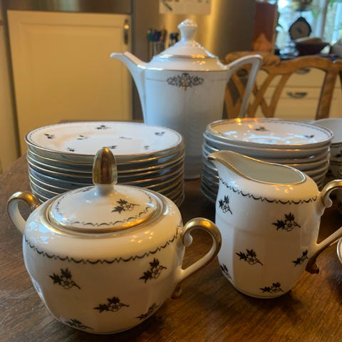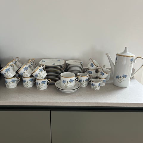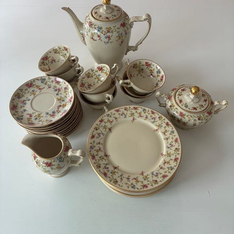 Servisen består av kaffekanna, gräddkanna, sockerskål, 7 koppar, 15 fat till kaffekopp och 11 assietter.