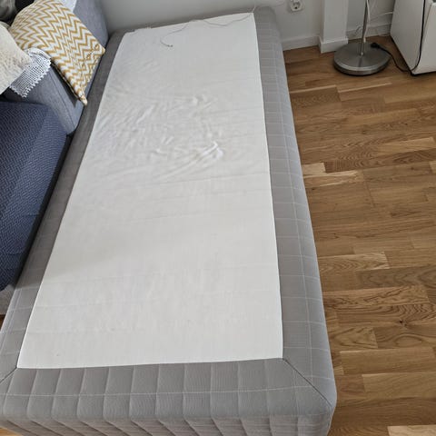 Sängen har en elektriskt ställbar botten med motor och metallram. Underredet består av en träram med skiva och mekanik för höj- och sänkfunktion av huvud- och fotända. Ovanpå ligger en quiltad bäddmadrass i ljus/vit färg.