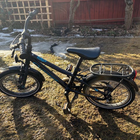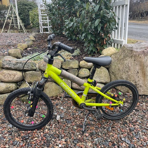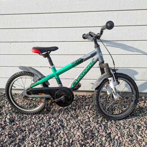 Crescent barncykel med 16" hjul i grön färg. Cykeln har fotbroms bak och handbroms fram, kedjeskydd, stänkskärmar och stöd. Sadel och styre är justerbara i höjd för att passa växande barn. Sadeln har en skada, så efter regn kan den läcka vatten.