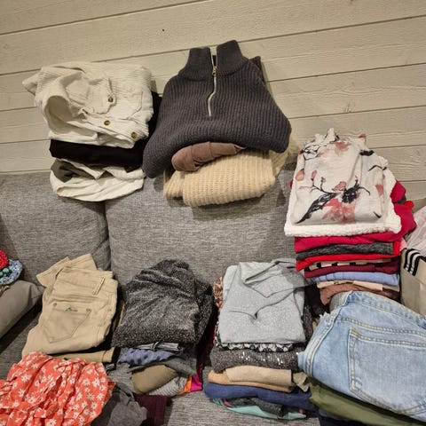 Det mesta är i bra skick och går att återanvända eller sälja på loppis. Vissa saker går säker laga också. Kläder och skor kan behöva tvättas.