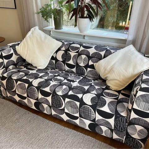 Fin svart 2-sits rottingsoffa med dyna som är typ naturvit i färgen
