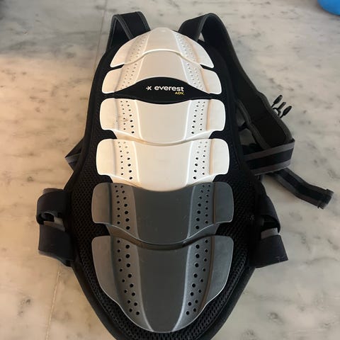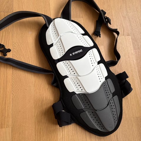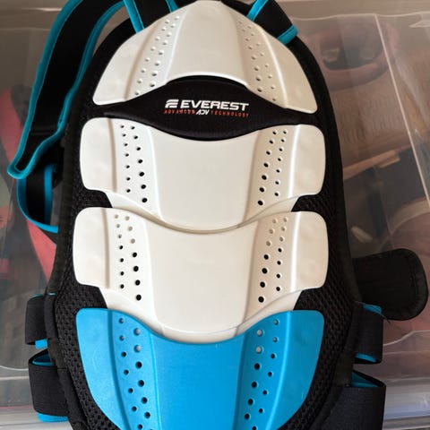 Everest ryggskydd för barn i storlek XS. Ytterskal med hårda, ventilerade skyddsplattor i svart och vitt samt vadderad insida i gult och svart. Justerbara axelremmar och midjerem med kardborre för att kunna anpassas efter kroppen. Avsett som skydd vid exempelvis skidåkning eller annan aktivitet där extra ryggskydd behövs.