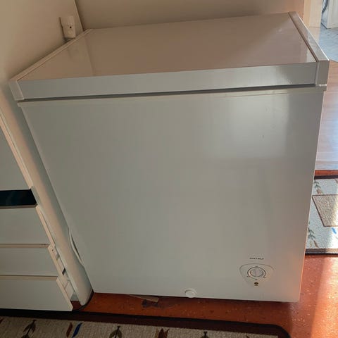 Elvita frysbox i vit färg. Locket öppnas uppåt och invändigt finns lösa trådkorgar för sortering av frysta varor. På fronten finns kontrollpanel med vred för temperaturinställning samt indikatorlampor. Passar för förvaring av matvaror i exempelvis hushåll, förråd eller garage där extra fryskapacitet behövs.