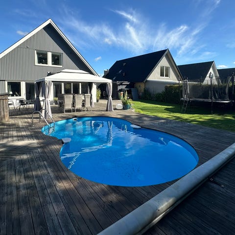 Poolskydd standardöverdrag. Mått 4,10 x 8,10 passar perfekt till Foolkpools Oktavia. Inkluderar poolskydd förr trapp.