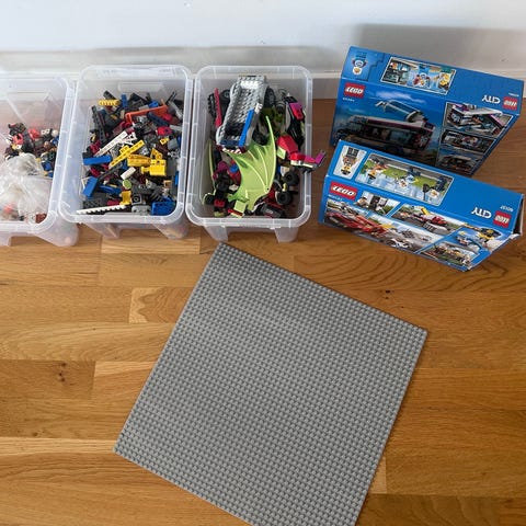 Lego blandade klossar och byggsatser i olika färger och former. Innehåller lösa bitar samt flera olika bygginstruktioner enligt bild. Ca 20 kg. Finns i färjestaden