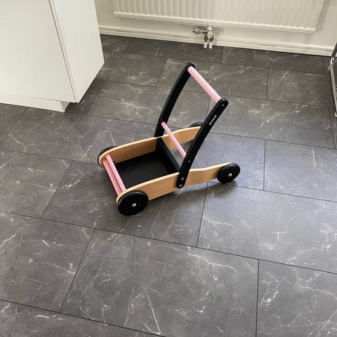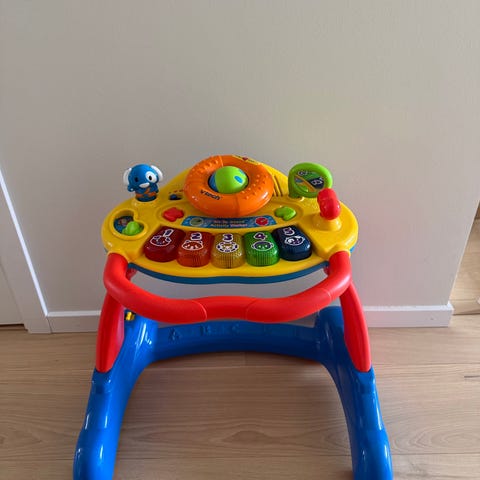 Vtech gåvagn och aktivitetsleksak Play 2 learn i färgglad plast och med musik. Leksaken har ett stabilt stativ med handtag för barn som tränar på att stå och gå. Ovandelen består av en aktivitetsbräda med olika knappar/tangenter för musik, reglage och snurrhjul i flera färger. Den roliga aktivitetsbrädan har bland annat numrerade tangenter, figurer och symboler som kan uppmuntra till lek med färger och siffror. Ljudet kan regleras i två steg och stängas av. Produkten är avsedd för små barn som stöd i de första stegen och som stående aktivitetscenter. Storlek ca 45*45*32 cm.