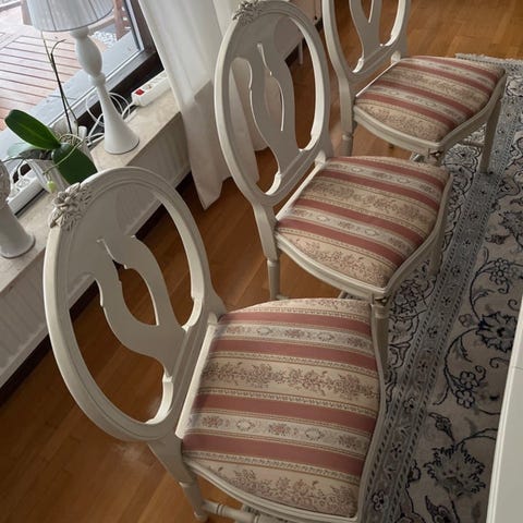 Två vitmålade stolar i gustaviansk stil med tygsots. Någon liten kanstötning(se bild). Lätt att byta tyg om man vill. Såldes pga platsbrist.