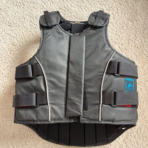 Hansbo Sport säkerhetsväst för barn i svart färg. Storlek Large. Västen har dragkedja framtill och vadderade paneler runtom för stötdämpning. Justerbara axel- och sidoremmar ger möjlighet till anpassad passform. Avsedd som skyddsväst för ridning eller annan liknande aktivitet där extra kroppsskydd önskas.