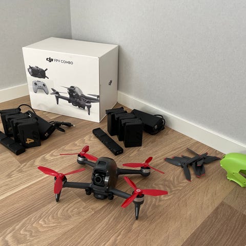 Flera drönare, radio, FPV-goggles samt reservdelar ingår.