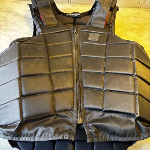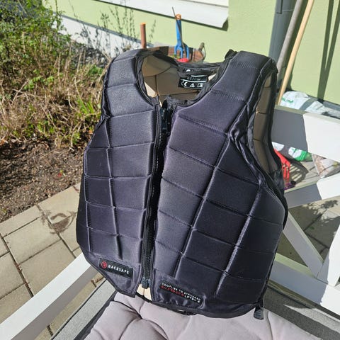 Smart Rider säkerhetsväst för ridning i barnstorlek L. Västen är svart med justerbara kardborreband i sidorna och på axlarna för att kunna anpassas efter kroppen. Bakstycket är förlängt för extra skydd över rygg och svank. Passar som skyddsutrustning vid ridning för barn i storlek L enligt storlekstabell på etikett.