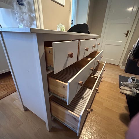 Byrå Hemnes från IKEA. Massivt trä, vitbetsad med 8 lådor.