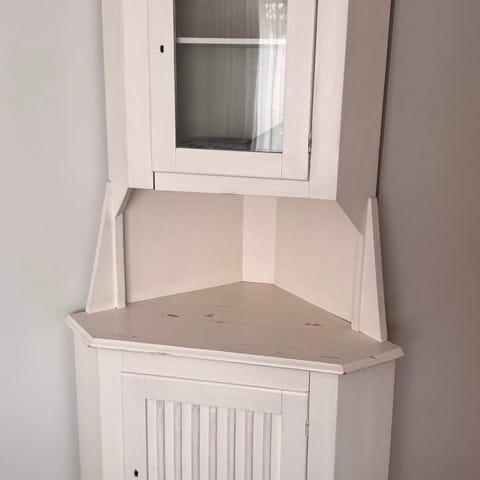 Hörnskåp med vitrindörr och låda längst ner. Tre fasta hyllplan. Den är från 1990- talet.