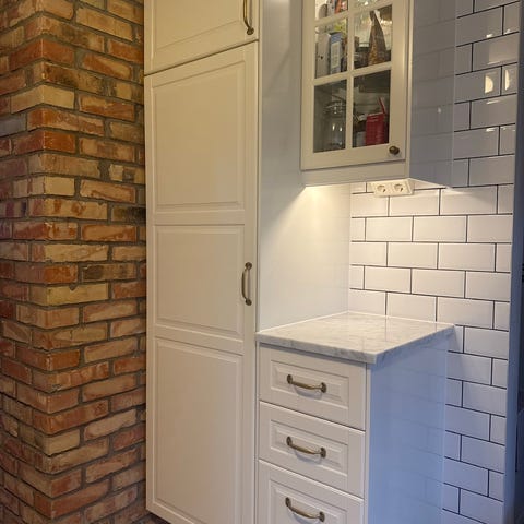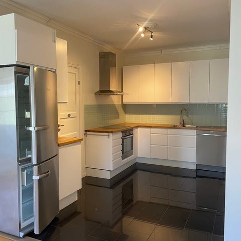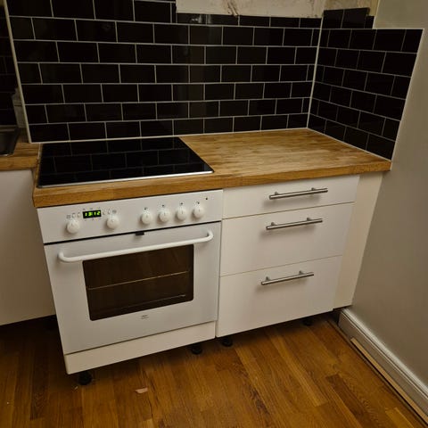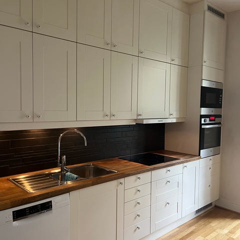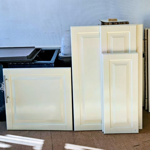 IKEA Faktum fronter Lillbyn. Tre fronter ink. Beslag enligt bild. Varit monterade till integrerad kyl och frys så skruvhål på två nedre luckorna.