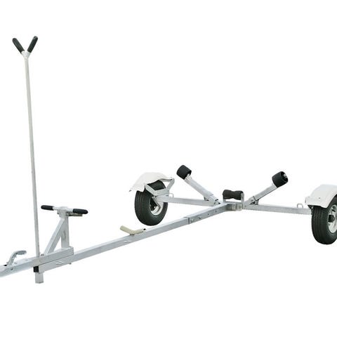 Båtupptagningsvagn med separat ställning för förvaring av båt på land. Vagnen har två hjulaxlar med däck och draganordning framtill. Ställningen är i metall och är utformad för att bära upp skrovet vid vinter- eller långtidsförvaring. Passar för upptagning och förvaring av båt där transport sker kortare sträckor, exempelvis inom tomt eller mellan ramp och uppställningsplats.