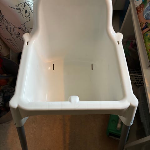 Stokke matstol med bricka och babyset i vit plast. Består av matbricka och babyset som monteras på stolen för att ge barnet en stabil sittplats vid bordet.