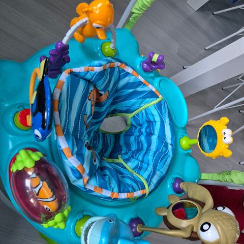 -Bland de färgglada leksakerna finns lejonrulle, klickande alligator, bitvänlig fjäril, elefant och flodhäst att slå på, färgglada lampor, spegel med mera