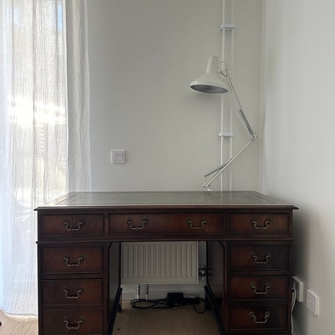 Stort skrivbord i engelsk stil med tillhörande stol.