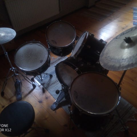 Pearl Export EX trumset i kromutförande. Virvel, tre hängpukor, två golpukor, dubbla kaggar, ride, crasch, hi-hat cymbaler, två dubbelpedaler, två hi- hat stativ, stol m.m. Fler bilder/ info skickas vid intresse.