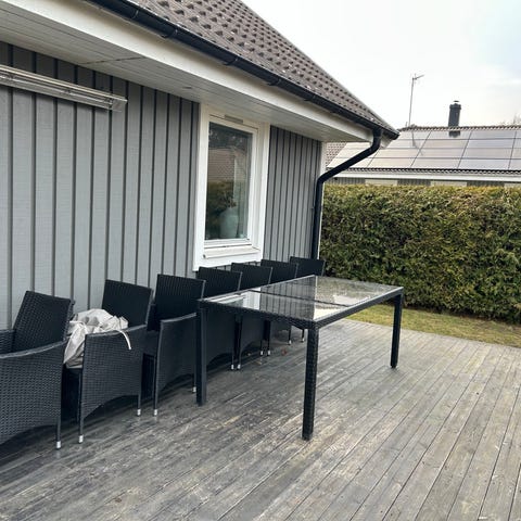 Passar som matgrupp på altan, uteplats eller trädgård där man önskar sittplatser för flera personer runt ett större bord.
