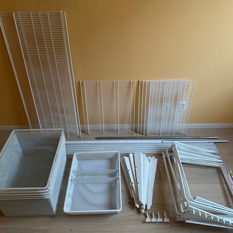 Har ställningar i olika höjd och bredd. Finns mer än vad som är på bilderna, inte plockat ihop allt. Korgar i olika djup och sorter till. Finns stora djupa i plast och grundare i plast med. Vissa ställningar går att ställa på varandra.